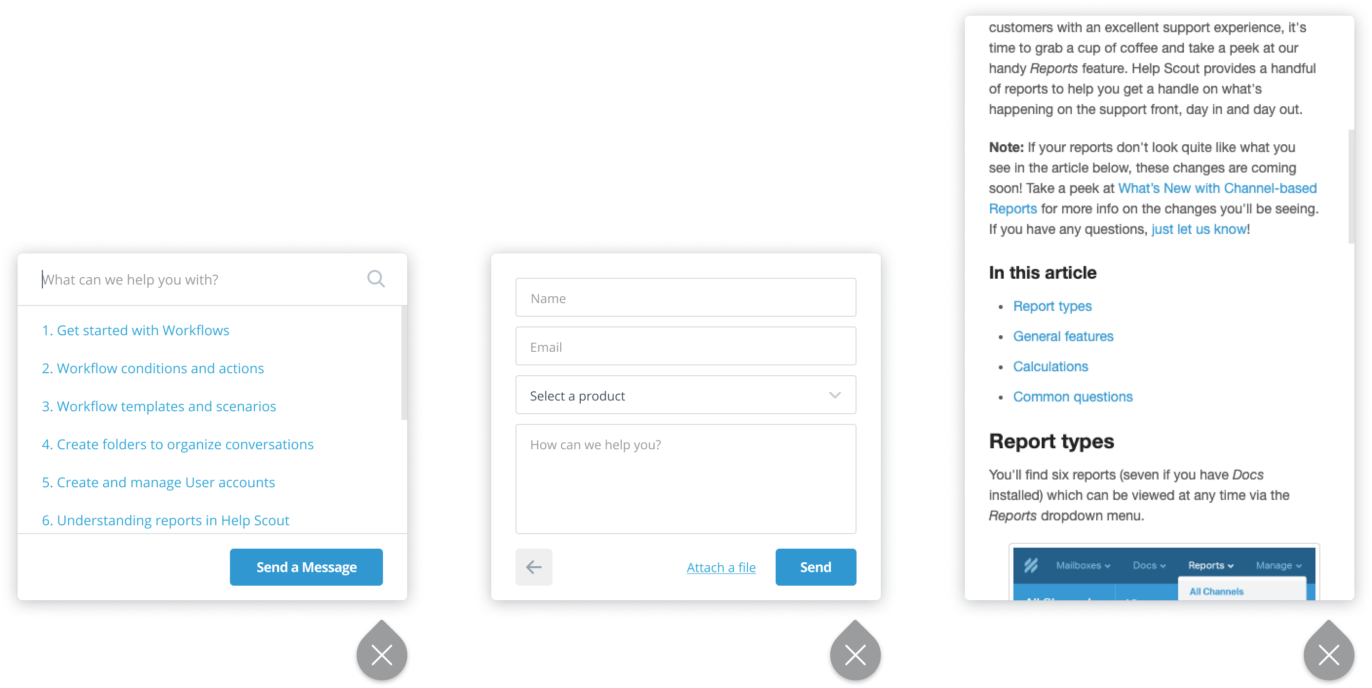 The brief was straight-forward enough — to bring chat as a communication channel to the Help Scout platform via the existing embeddable widget, Beacon. The original Beacon (shown below) was designed as a super simple way to view help documentation within our customers’ websites — though never intended to extend to much more. So... add chat to the widget and call it a day. Right?