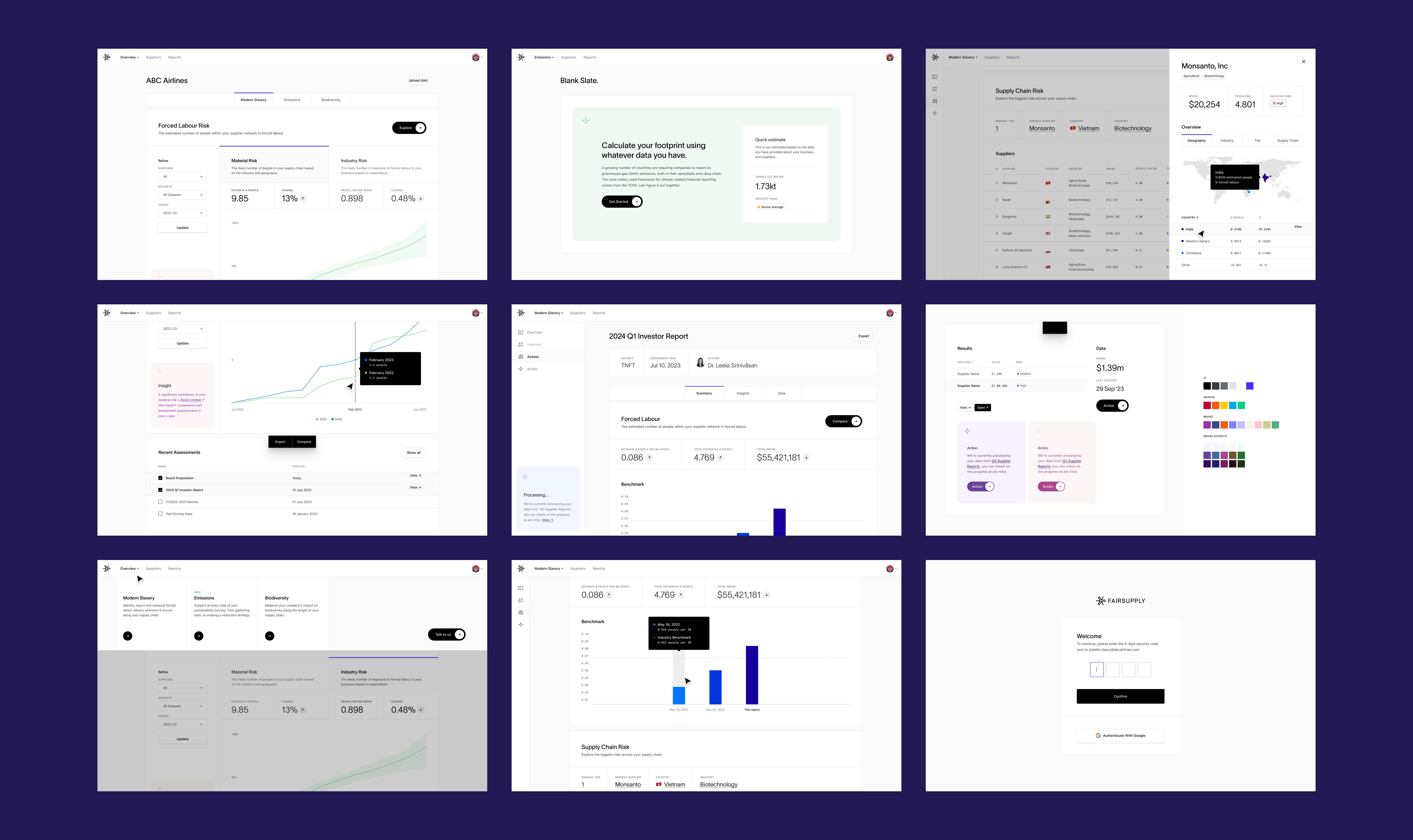 A key visual choice we made was prioritizing data over aesthetics. I encouraged the team to embrace a nearly all black-and-white UI, reserving color solely for highlighting data. These constraints pushed Fair Supply to be one of the most challenging visual projects I’ve taken on — and led to some truly unique results.