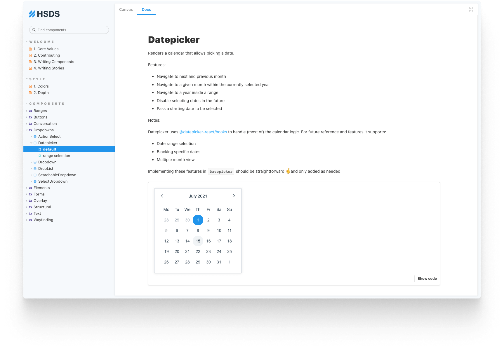 Everything with a verified status in Figma had corresponding code in Storybook — complete with documentation, ownership and reciprocal links. This made it easy for any engineer to find and consume components whether they were navigating a spec in Figma, or reading code in React.